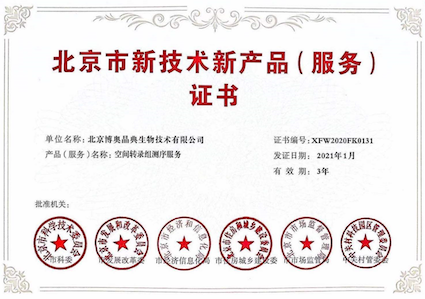 “北京市新技术新产品(服务)认定”旨在有助于高新技术产业的开展,作为北京市新技术新产品,应拥有自主知识产权,并具有技术先进性和创新性。本次喜获“空间转录组测序服务”荣誉证书是各委员会对k8凯发国际创新能力的高度赞扬和肯定,同时体现了k8凯发国际空间转录组测序服务在行业内的技术优势。