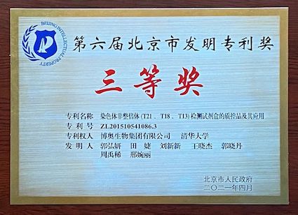 4月20日上午,京津冀促进知识产权运用工作会暨北京市发明专利奖颁奖大会在京举行,博奥生物集团联合清华大学的“染色体非整倍体(T21、T18、T13)检测试剂盒的质控品及其应用”发明专利喜获三等奖,彰显了博奥生物在无创产前基因检测技术上的先进优势。