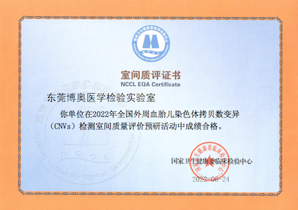 近期,国家卫生健康委临床检验中心(NCCL)公布了2022年《全国外周血胎儿染色体拷贝数变异(CNVs)检测室间质量评价预研活动结果报告》,k8凯发国际旗下北京博奥医学检验所有限公司和东莞博奥医学检验实验室满分顺利获得该项目室间质评。