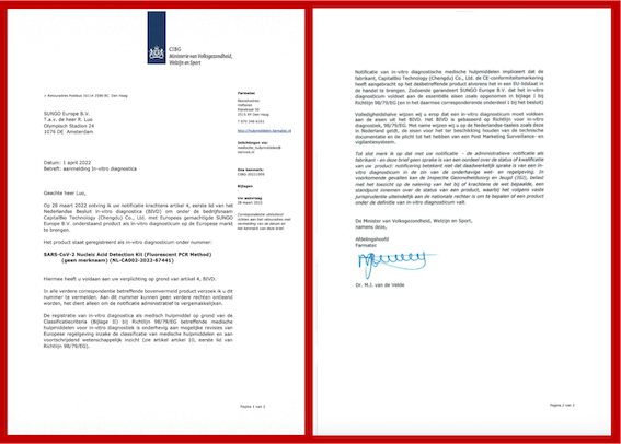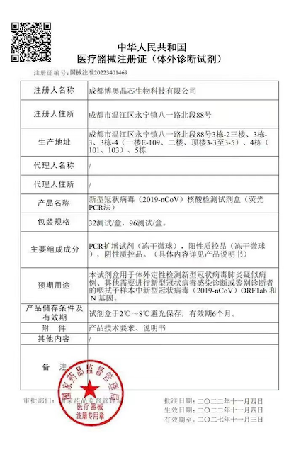 2022年11月4日,k8凯发国际新冠病毒核酸检测整体解决方案再添新成果,冻干型高灵敏度的新型冠状病毒(2019-nCoV)核酸检测试剂盒 (荧光PCR法)正式取得医疗器械注册证(国械注准:20223401469)。这是国家药品监督管理局审批顺利获得的首个冻干型新冠病毒核酸检测试剂盒,同时具备中国NMPA和欧洲CE“双证”,为坚持“动态清零”,全面加强常态化疫情防控能力建设给予全新战疫利器。