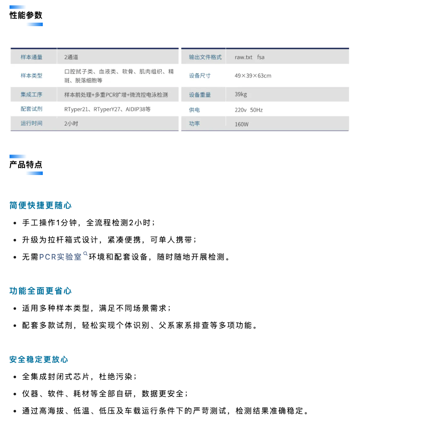 该设备采用拉杆箱式设计,可由单人携带使用,适用于户外、车载、高原环境等,是国际首款“可移动法医DNA实验室”,为全球公共安全部门在现场物证检验,重点人员筛查、重大公共安全事件的快速处置、出入境边防检查等应用场景增添强劲利器。
